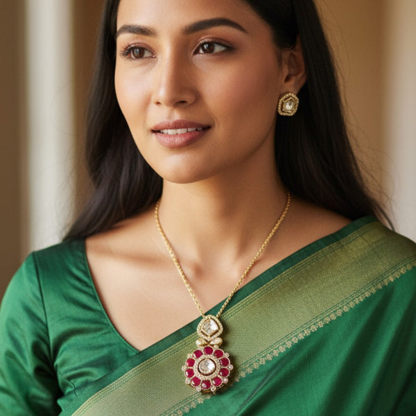This is a stunning golden and american diamond jewelry set featuring a necklace with a statement pendant and matching earrings. The pendant showcases a beautiful floral design with a central diamond encircled by vibrant red enamel petals, enhancing its regal charm. The upper part of the pendant has a geometric diamond setting, which is mirrored in the earrings, creating a cohesive and elegant look. The delicate gold chain adds subtle sophistication, making this set perfect for traditional occasions, weddings, or festive celebrations.