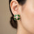 These exquisite floral stud earrings radiate timeless charm with their striking petal-like design. Crafted in a golden base, each petal is inlaid with vivid green emerald-toned stones, perfectly outlined with a halo of shimmering white crystals. At the center lies a bold rectangular stone, adding grandeur and brilliance. Elegant yet eye-catching, these studs are ideal for weddings, festive gatherings, or as a luxurious statement piece.